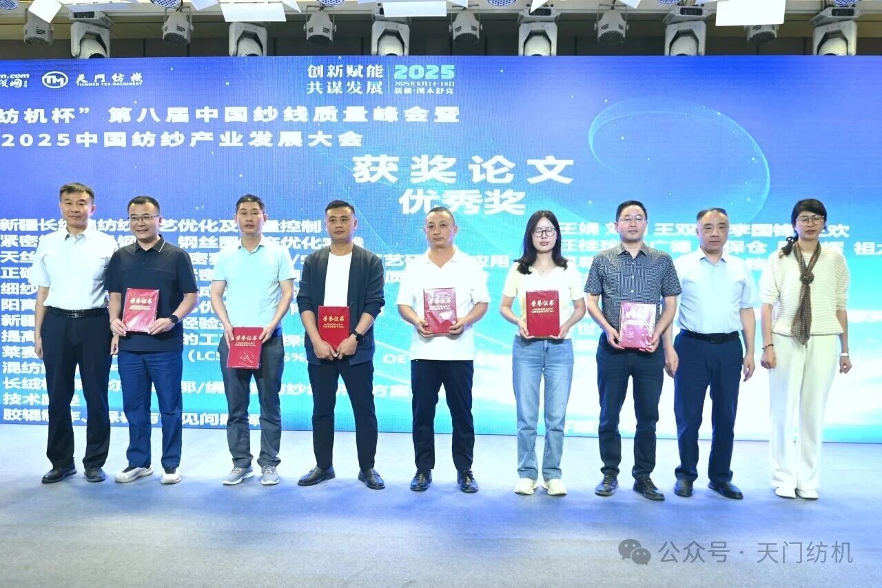 開幕式上,隆重舉行了“天門紡機杯”第八屆中國紗線質量峰會獲獎論文頒獎活動,新疆維吾爾自治區紡織工程學會理事長、新疆大學紡織與服裝學院院長夏鑫,天門紡機總經理焦倫進,中國紗線網總裁鞠彥軍為獲獎作者頒發了證書和獎金。